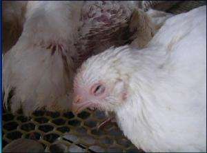 雞群出現閉眼、低頭呆立狀況;甚至出現呼吸困難、張口伸頸、咳嗽甩鼻;大群不增料,初期出現黃綠色稀糞、死亡率達到0.5-1%。