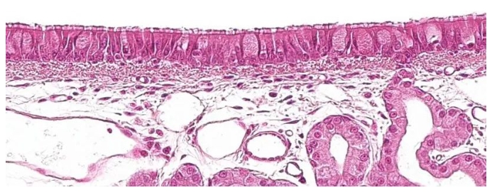 圖1:帶有杯狀細胞的纖毛假復層上皮,是呼吸系統的特征
